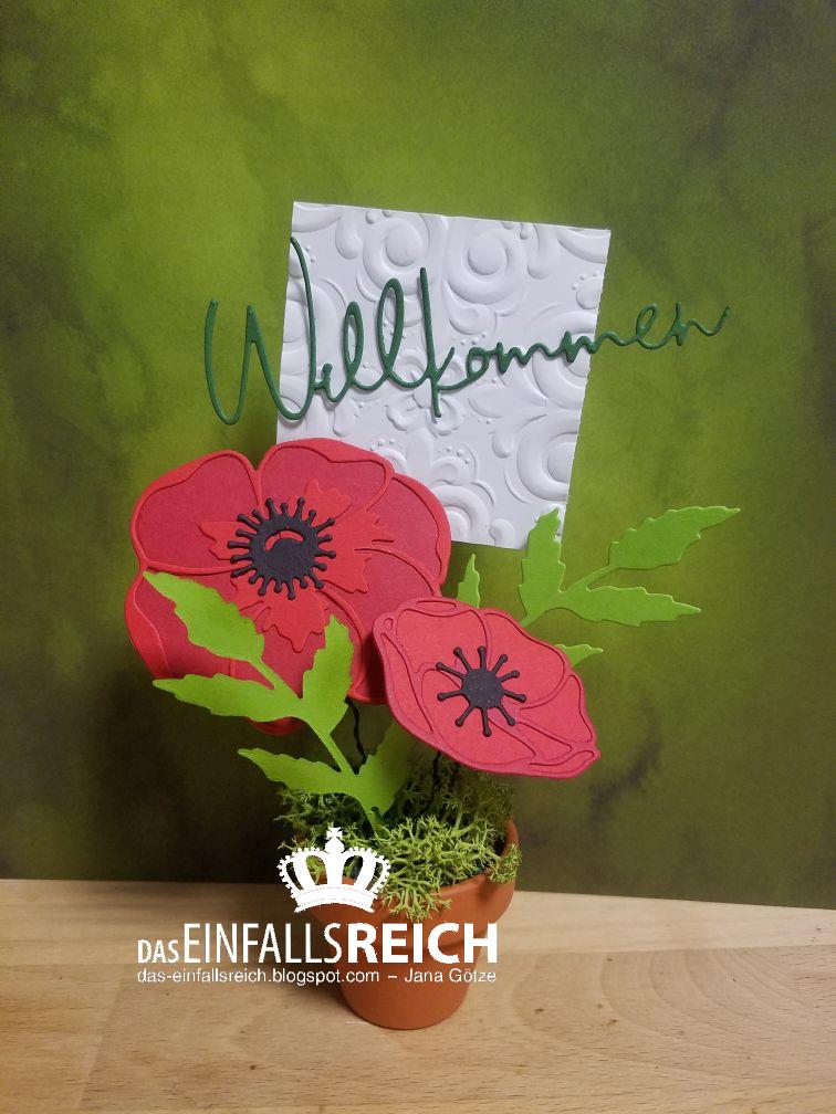 Beim gestrigen, ersten Kreativworkshop vom EinfallsReich in diesem Jahr haben wir unter anderem eine Mohnblumenverpackung gewerkelt. (Den weißen Fuß kann man öffnen und eine kleine Süßigkeit drin verstecken.) Als weiteres Muster für die Mohnblumenverwendung habe ich noch eine Mohnblume im Terrakotta Topf gemacht, die gleichzeitig ein Memohalter ist.
